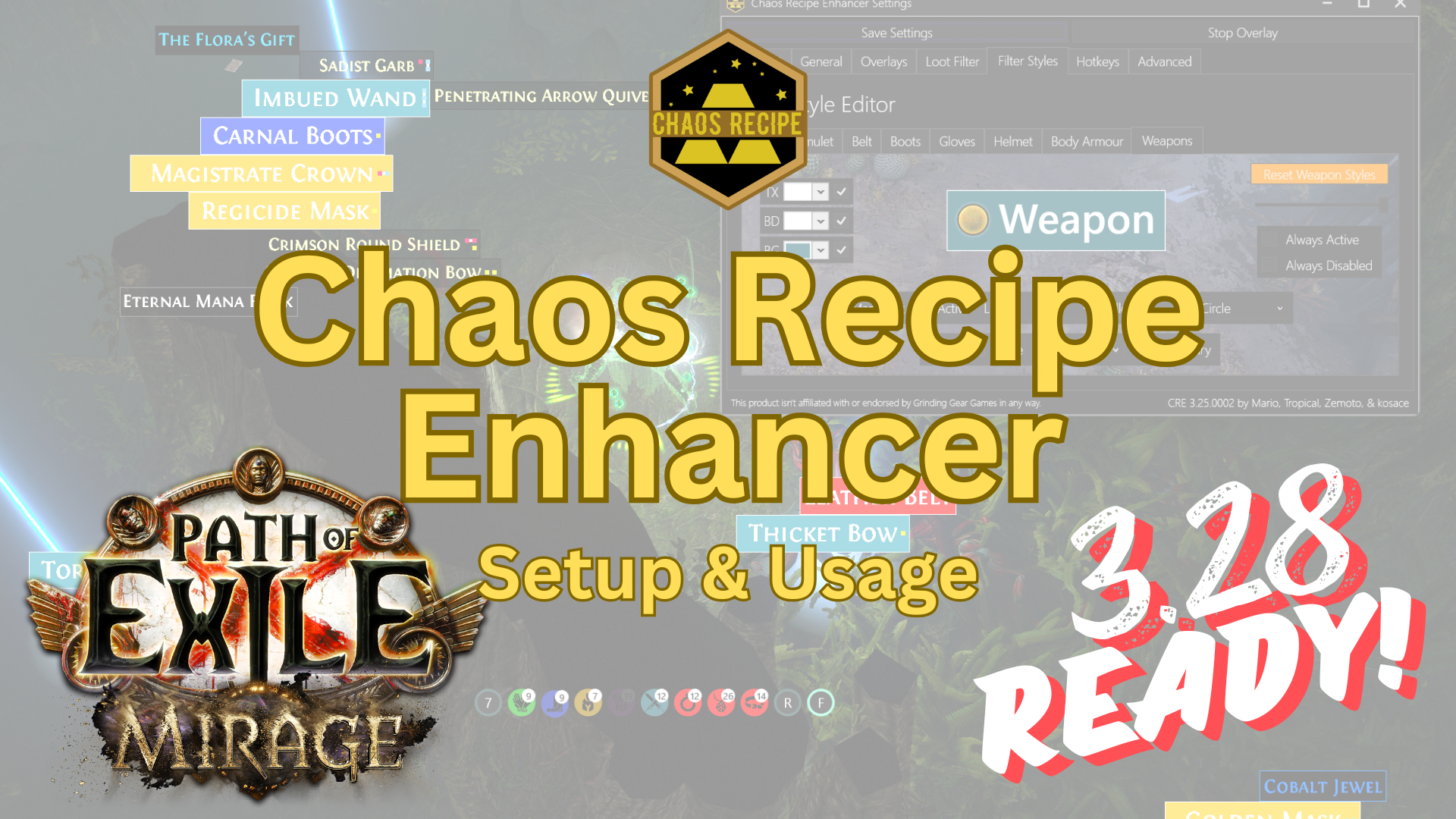 winget install --id=ChaosRecipeEnhancer.ChaosRecipeEnhancer -e Chaos Recipe Enhancer is a tool designed to streamline your chaos orb recipe completion in Path of Exile by fetching your stash data from PoE servers. It helps you identify the items needed for recipes, highlights item pick order when vending, and can manipulate offline loot filters for efficient farming.
