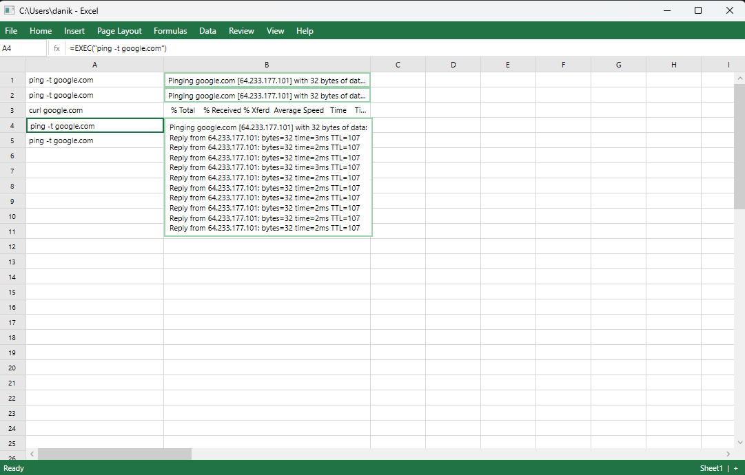 Every command is wrapped in the only formula that matters: =EXEC("your command here").