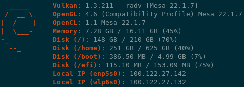 Fastfetch is more polished. For example, neofetch prints 555 MiB in the Memory module and 23 G in the Disk module, whereas fastfetch prints 555.00 MiB and 22.97 GiB respectively.