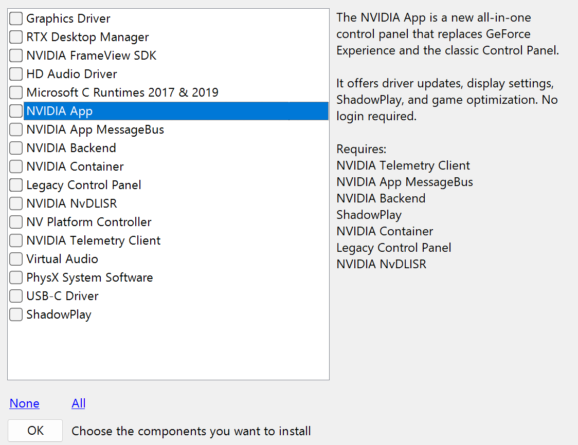 Stops the NVIDIA spyware from being installed on your computer. You choose EXACTLY which components of the driver you actually want to install.