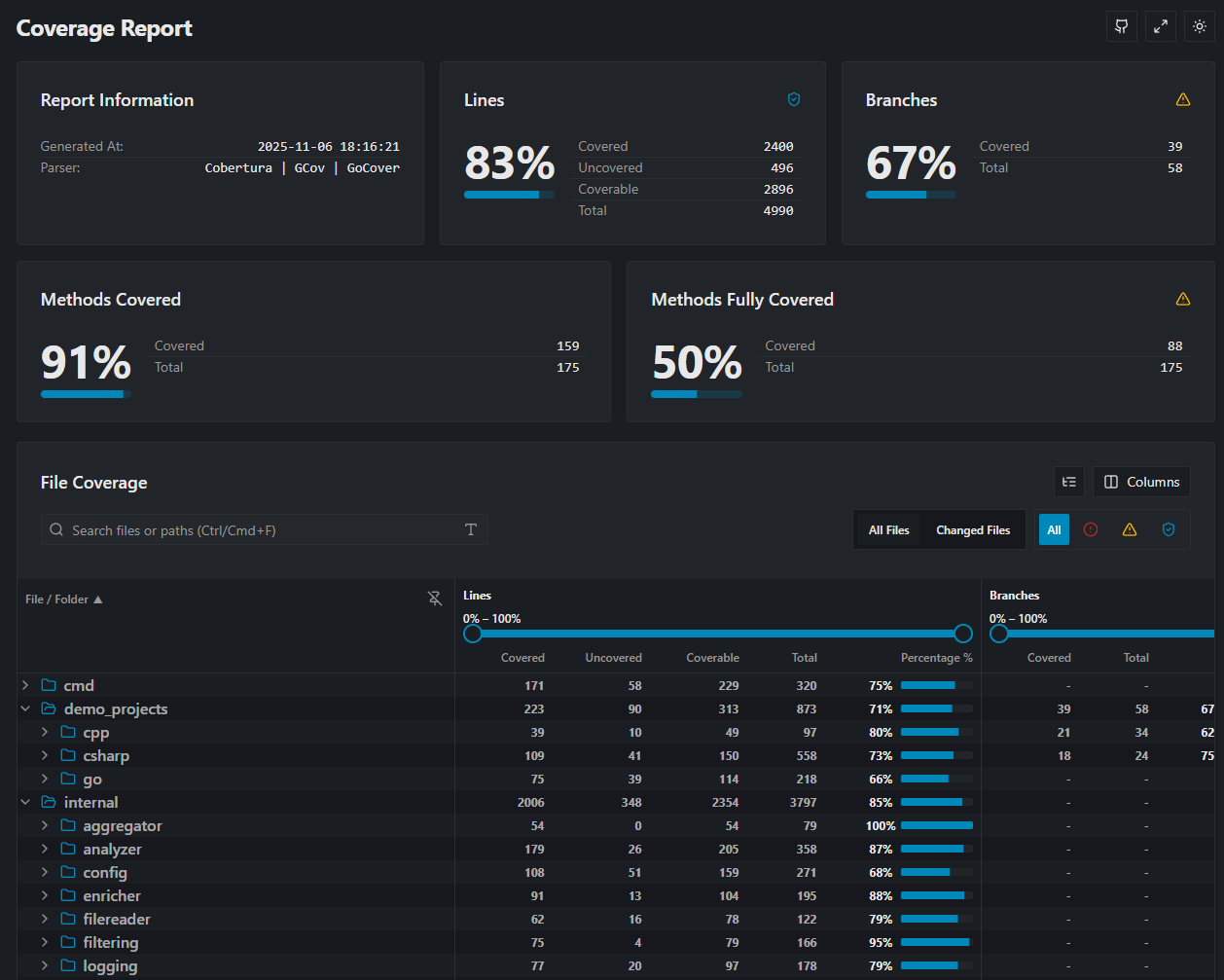 - Report Merging: Combine coverage data from multiple sources (e.g., unit tests, integration tests) into a single unified view.