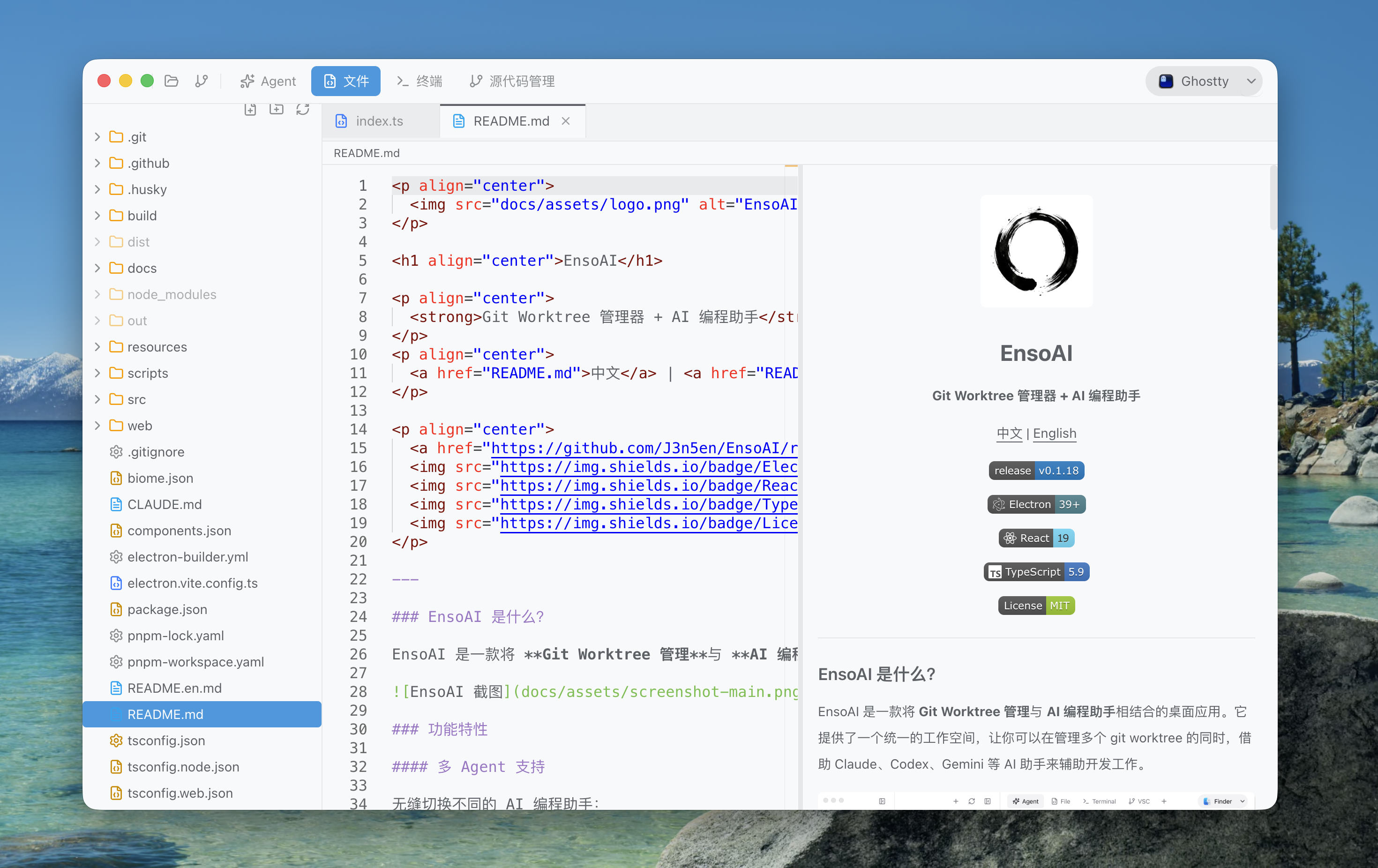Best suited for small to medium projects. For large monorepos, we recommend using it alongside VS Code or similar full-featured IDEs — EnsoAI handles worktree management and AI interaction, while the IDE handles deep development.
