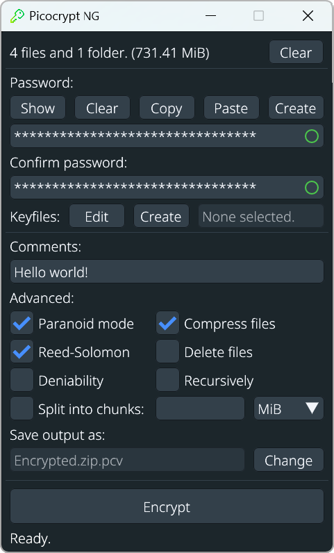Picocrypt NG is a very simple tool and most users will intuitively understand how to use it in a few seconds. On a basic level, simply dropping your files, entering a password, and hitting Encrypt is all that's needed to encrypt your files. Dropping the output back into Picocrypt NG, entering the password, and hitting Decrypt is all that's needed to decrypt those files. Pretty simple, right?