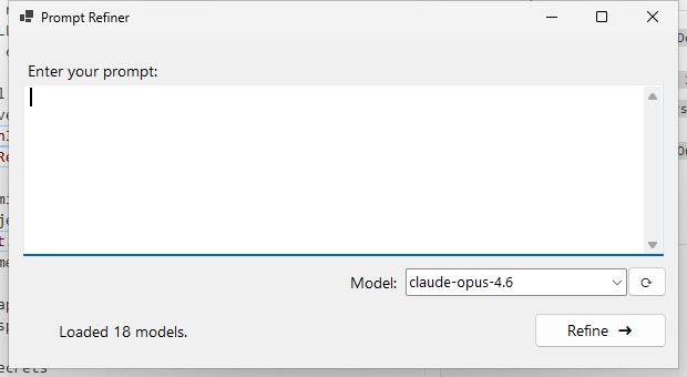 Prompt Refiner is a lightweight Windows desktop application designed to enhance and refine user prompts by leveraging large language models (LLMs) via the GitHub Copilot SDK. It provides a streamlined tool for users to input a basic prompt, process it through an LLM, and receive a polished, comprehensive version.