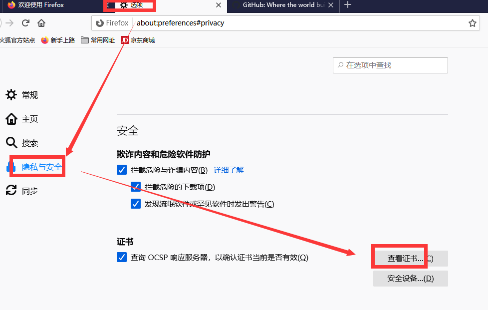 - 火狐浏览器->选项->隐私与安全->证书->查看证书
