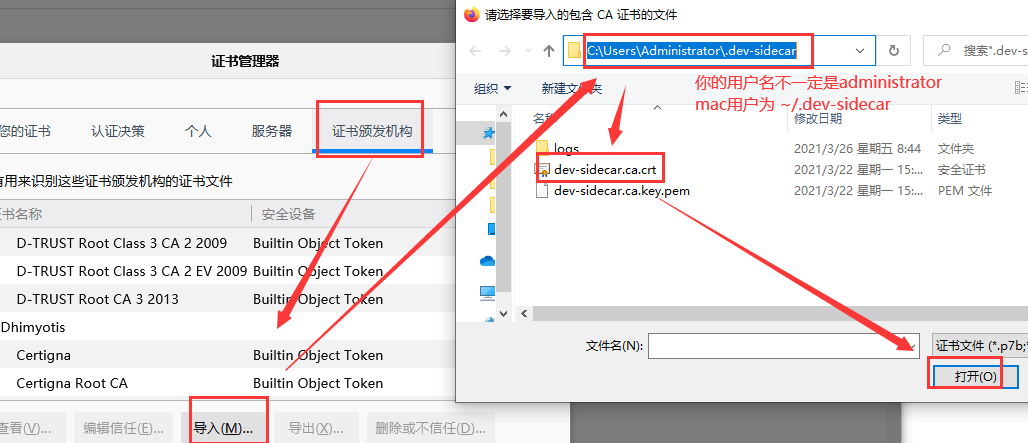 C:\Users(用户)\Administrator(你的账号)\.dev-sidecar\dev-sidecar.ca.crt(Mac或linux为 ~/.dev-sidecar 目录)
