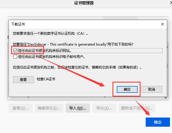 - 勾选信任由此证书颁发机构来标识网站,确定即可