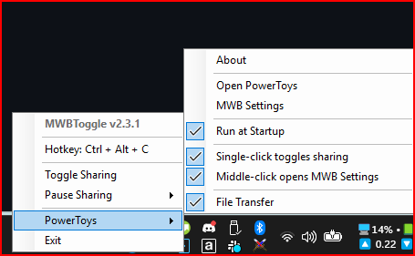 - PowerToys submenu: Quick access to PowerToys MWB settings and the legacy MWB configuration