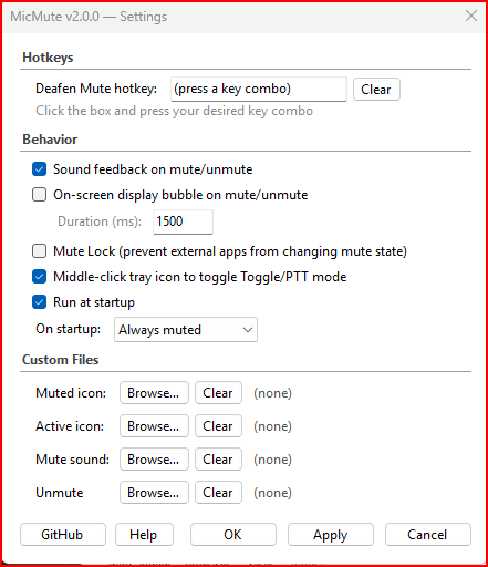 MuteSound / UnmuteSound | (empty) | Custom .wav file paths |