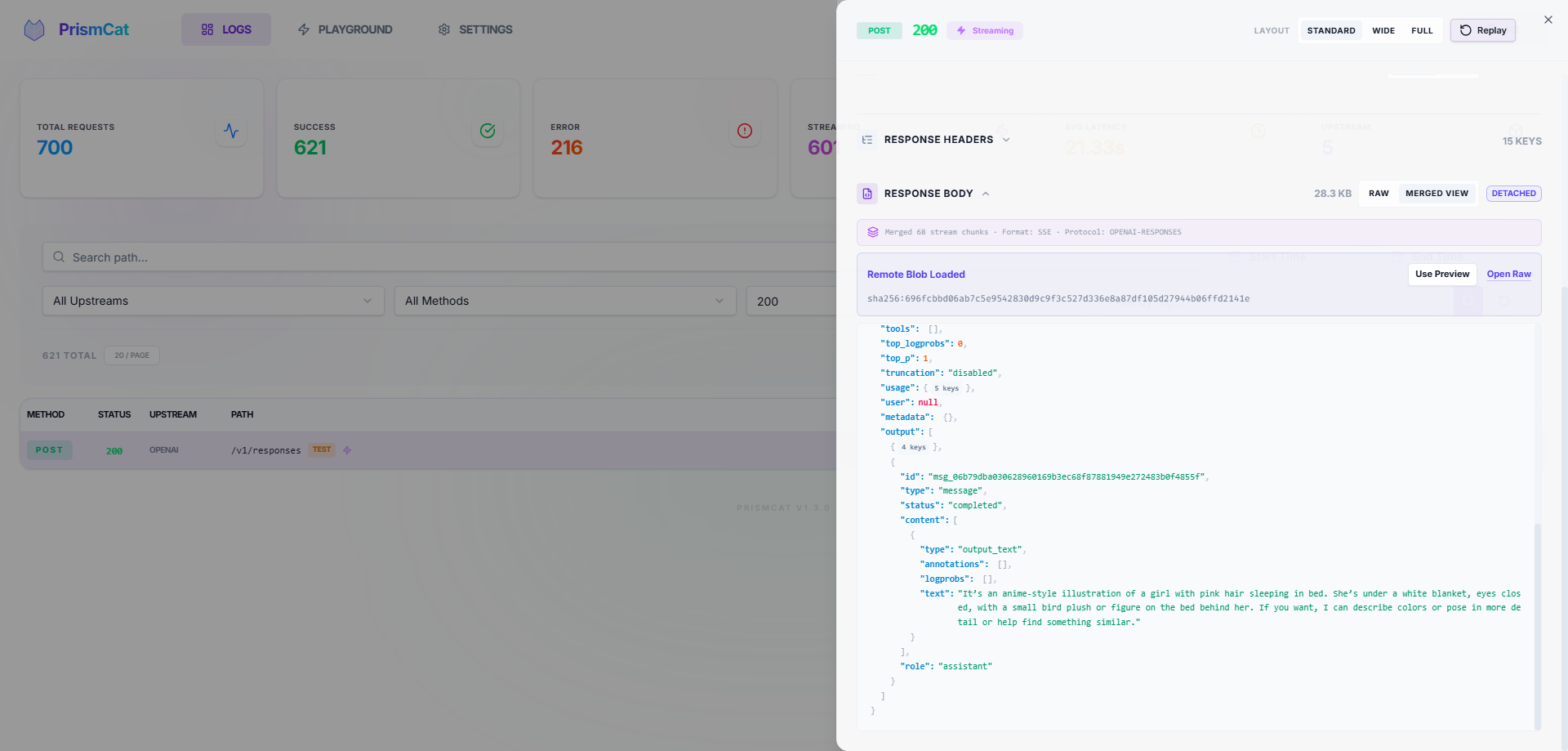 PrismCat is designed to run as a silent, 24/7 LLM black box. You don't need to "remember to start capturing" when a bug happens — it's already recording. Automatic log retention cleanup and large-body offloading keep storage healthy over months of continuous operation. Perfect for monitoring autonomous Agents that you can't fully predict — just go back and review what they actually sent and received, days after the fact.