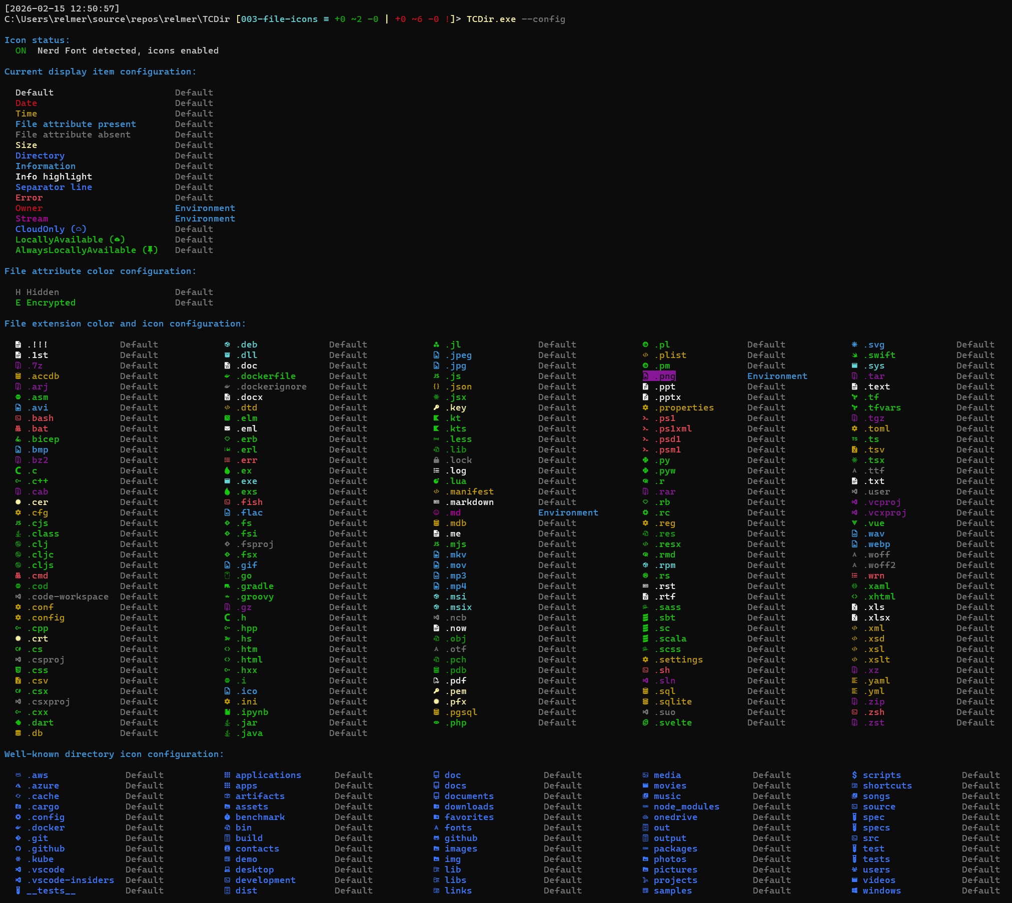 Icon mappings (~200 extensions, ~65 well-known directories) are aligned with the Terminal-Icons PowerShell module default theme.