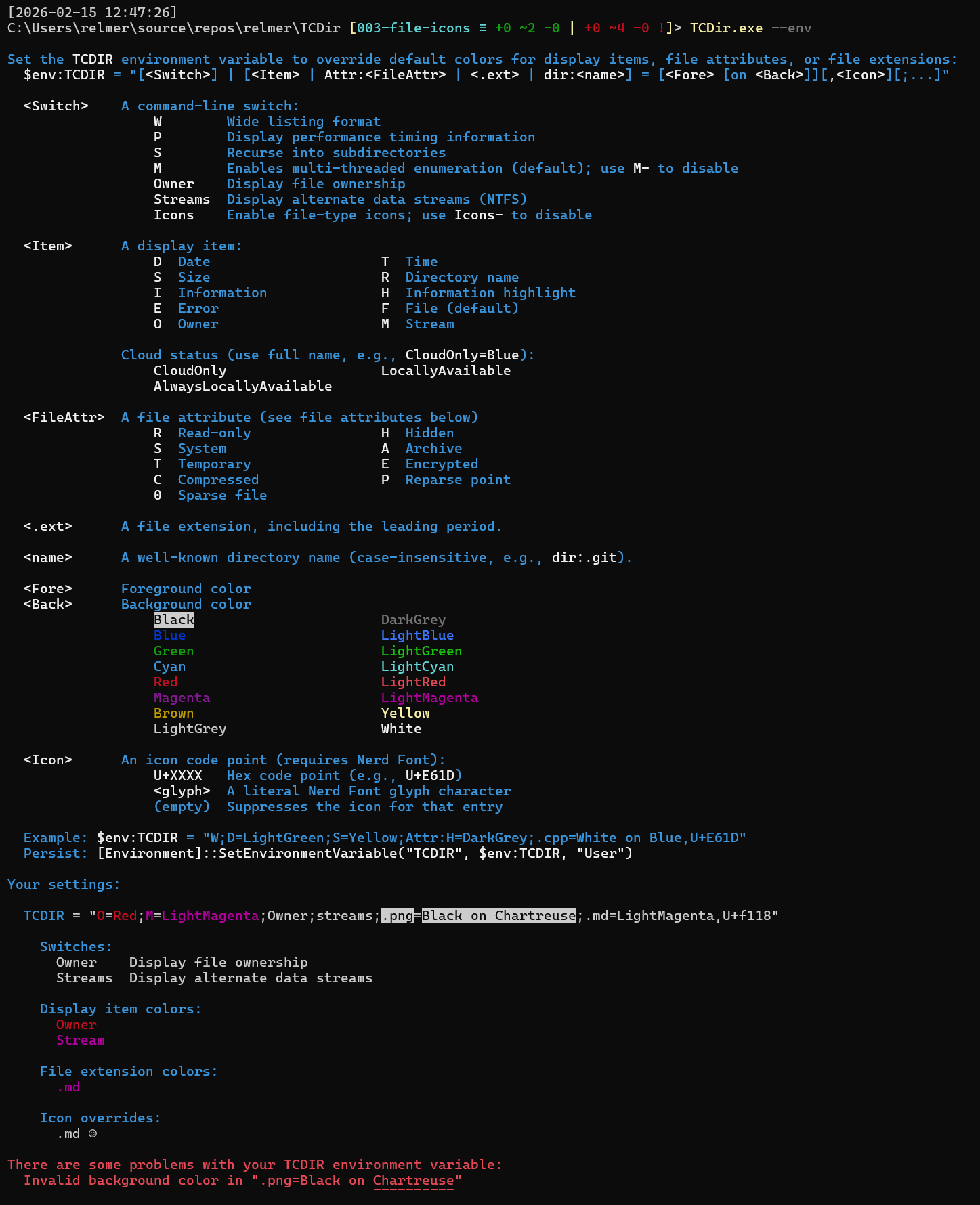 TCDir supports customizing colors (and default switch behavior) via the TCDIR environment variable.