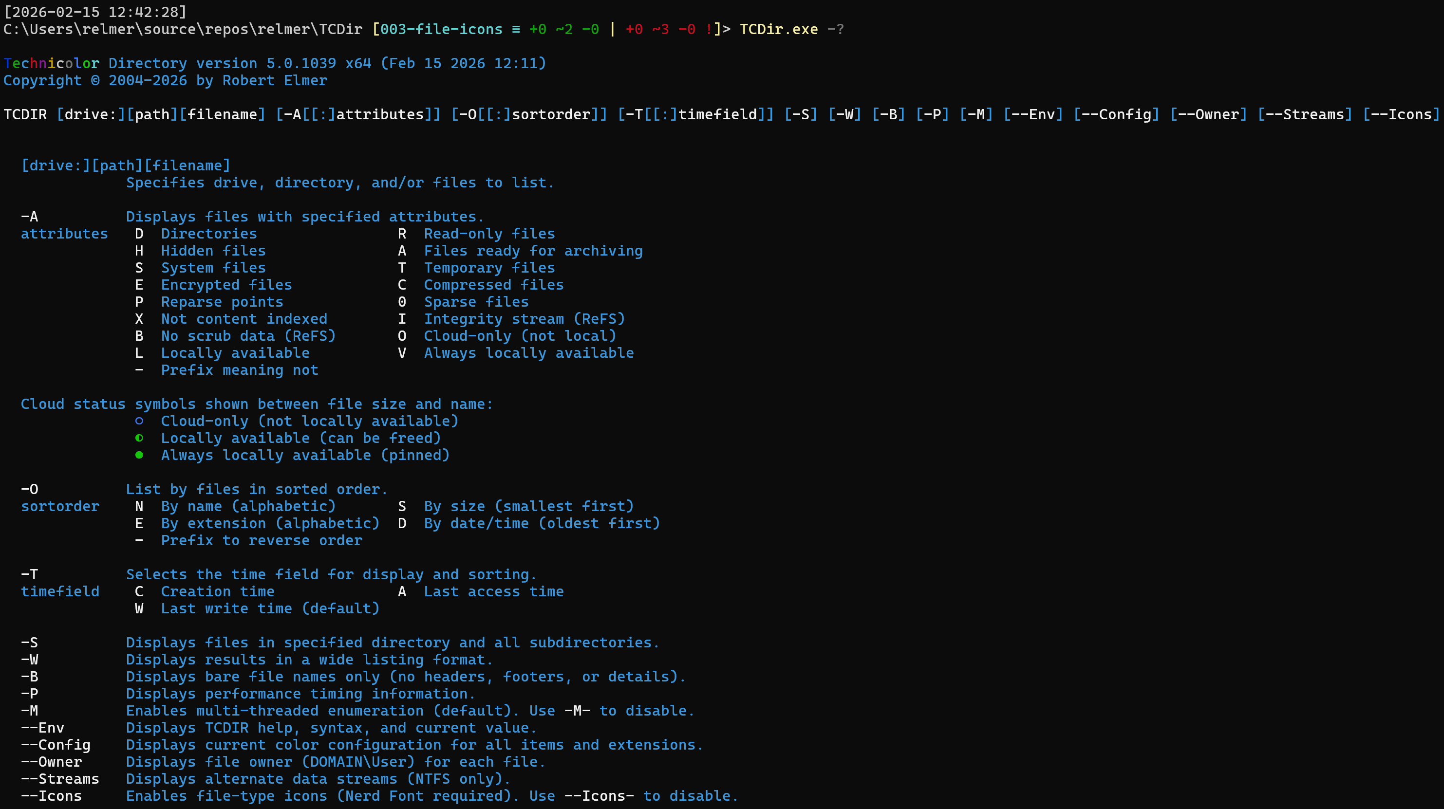 TCDIR [drive:][path][filename] [-A[[:]attributes]] [-O[[:]sortorder]] [-T[[:]timefield]] [-S] [-W] [-B] [-P] [-M] [--Env] [--Config] [--Owner] [--Streams] [--Icons] [--Tree] [--Depth=N] [--TreeIndent=N] [--Size=Auto|Bytes]