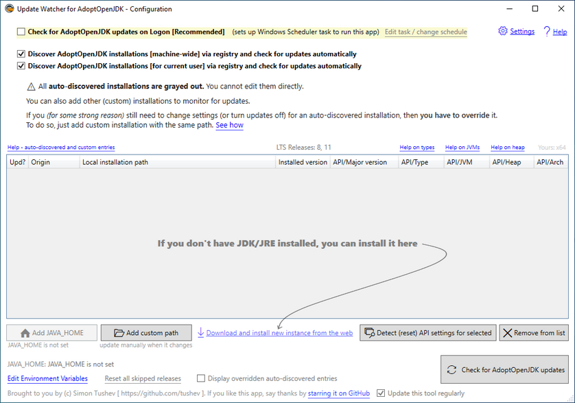 When this app launches, it gets versions for your local installations of JDK/JRE (either from Windows Registry or from release file). Then it queries AdoptOpenJDK API to check if there are versions newer than yours.